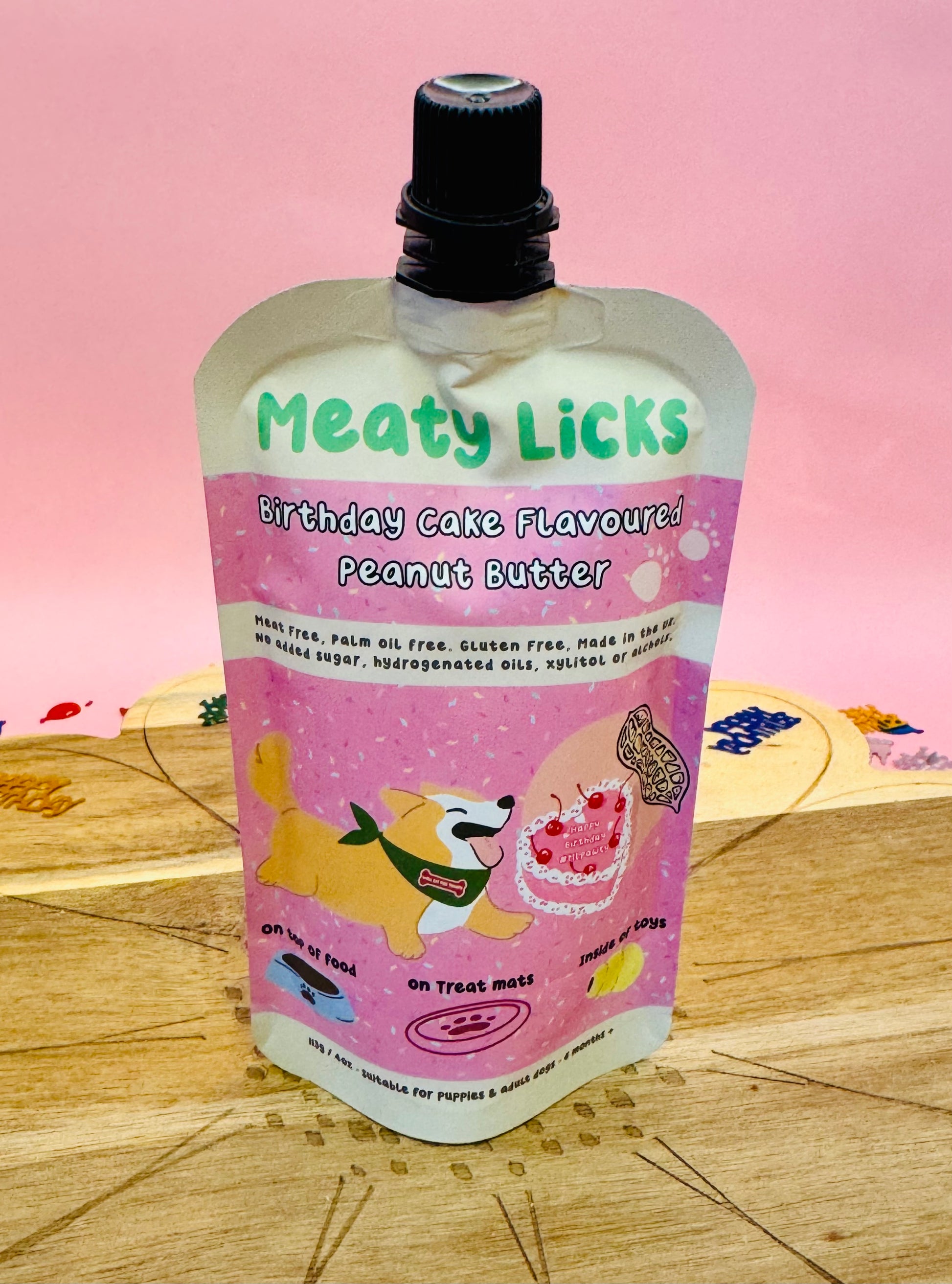 Introducing Meaty Licks—a premium range of vegan, gluten-free peanut butter pouches crafted in North Wales, UK, specifically for dogs.