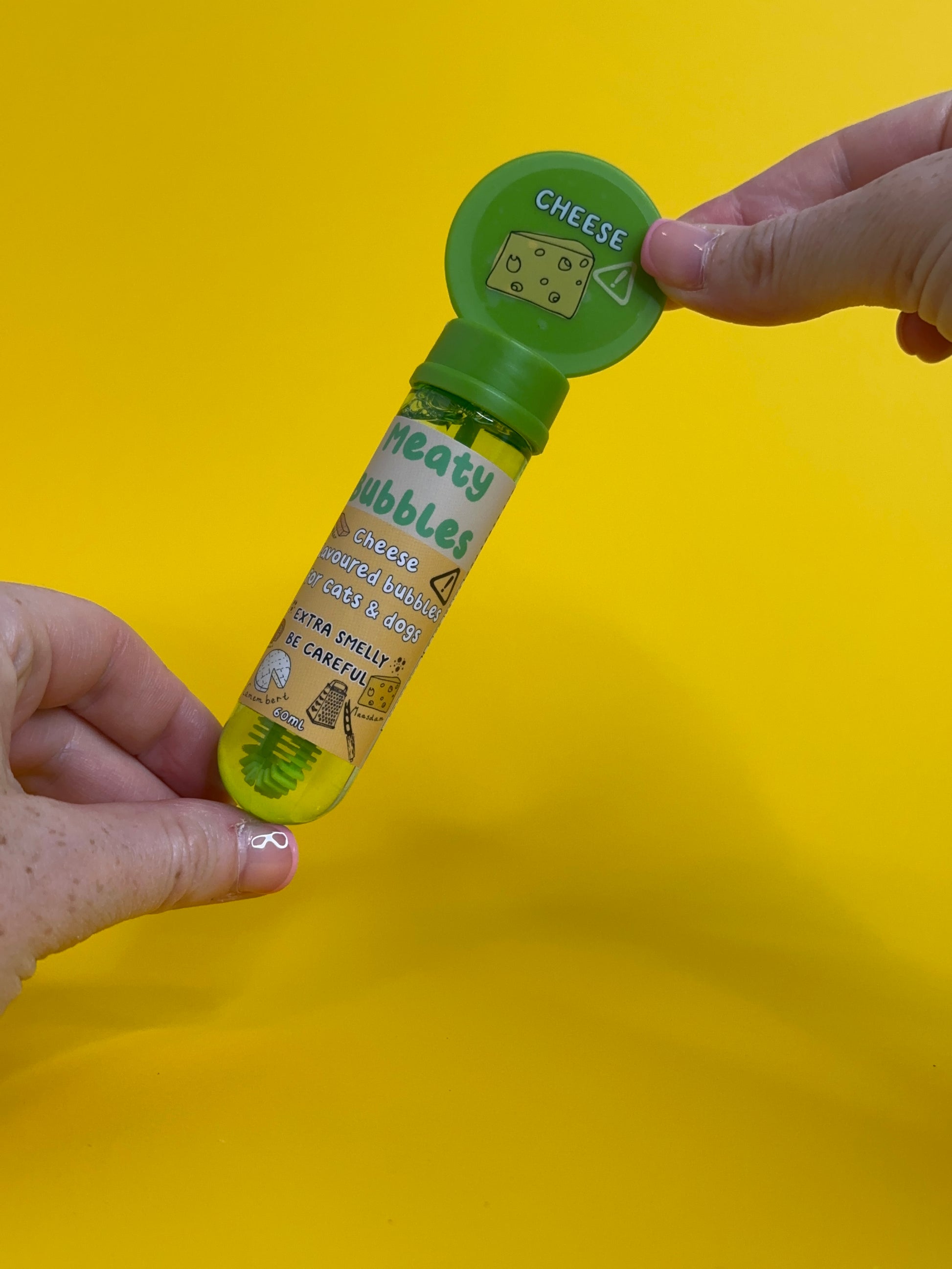 Is your pup crazy for cheese? Meet Meaty Bubbles in a cheddar-scented twist that dogs adore! These bubbles are mess-free and stink-free, making playtime a breeze. Enjoy cheesy, tangy scents that get tails wagging, with a safe, non-toxic formula that’s vegan, gluten-free, and halal-friendly. The new easy-to-use bottle is perfect for fun, distraction, or enrichment. Let the bubbly cheese fun begin!