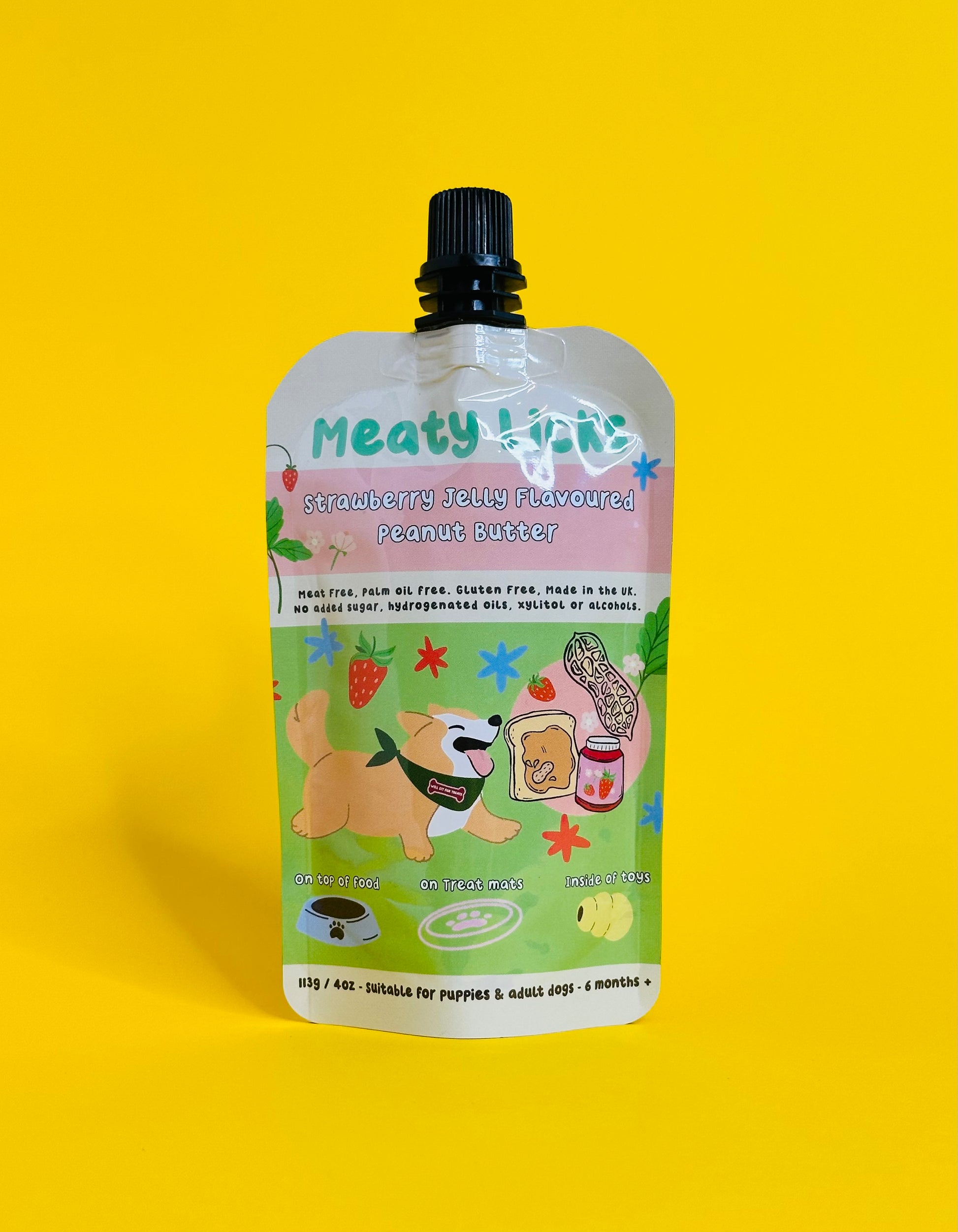 Strawberry jam peanut butter pouches, just right for a fun afternoon tea party with your pup! These vegan, gluten-free treats are made in North Wales, UK, specially for dogs. Packed with tasty, high-quality ingredients, Meaty Licks add a burst of flavor and enrichment to your dog’s day. Perfect for pups with sensitive diets or owners who love plant-based options. Use them on lick mats, during training, or as a tidy, on-the-go snack during walks. Made with pride in the UK, Meaty Licks bring top-notch yumminess to every lick!
