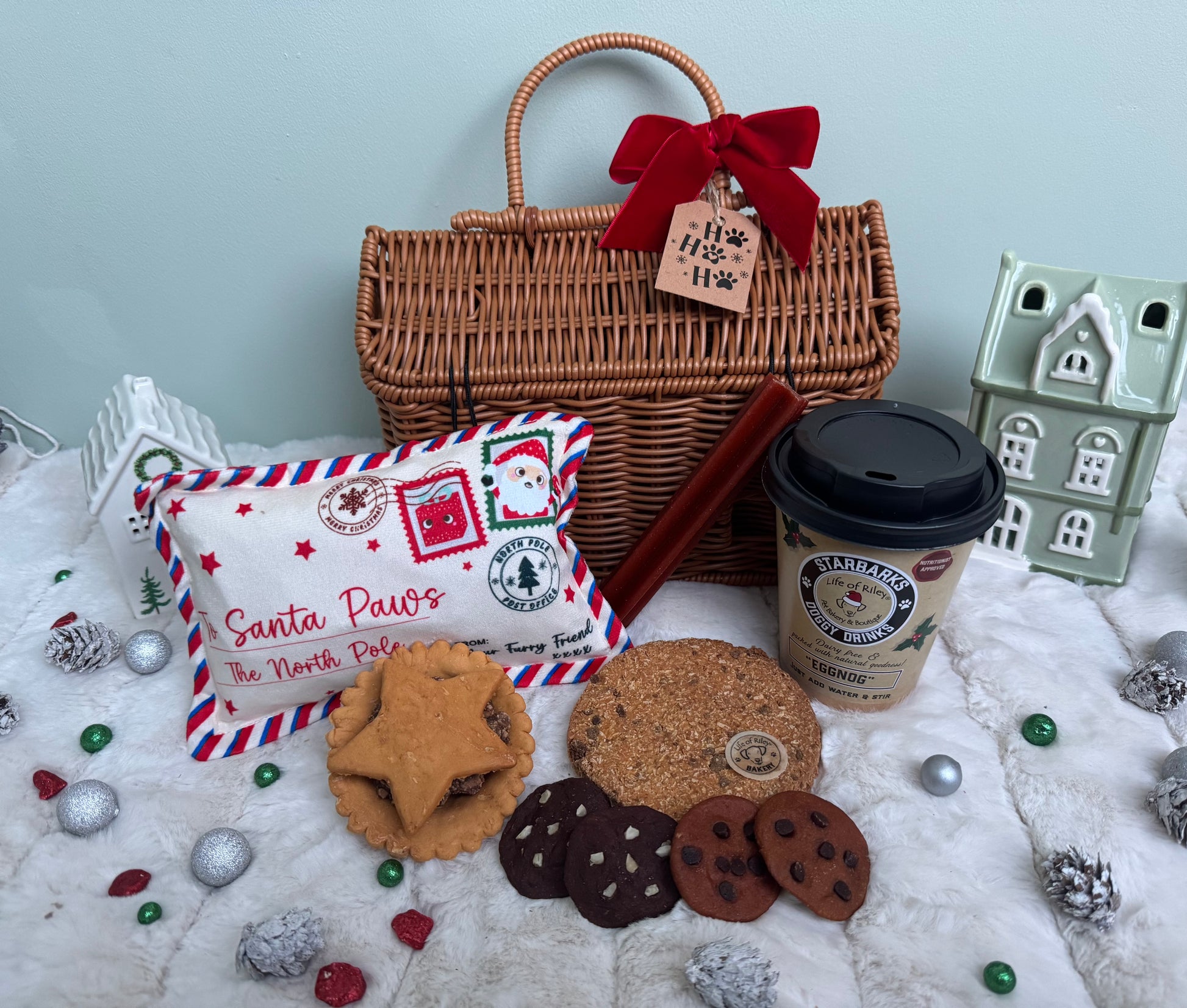 Letter to Santa Paws toy, Life of Riley Cookie, 4 x Duck & Chicken Christmas cookies, Life of Riley Starbarks Eggnog, Life of Riley Mince Pie, carrot veggie stick. Comes in a wicker hamper.