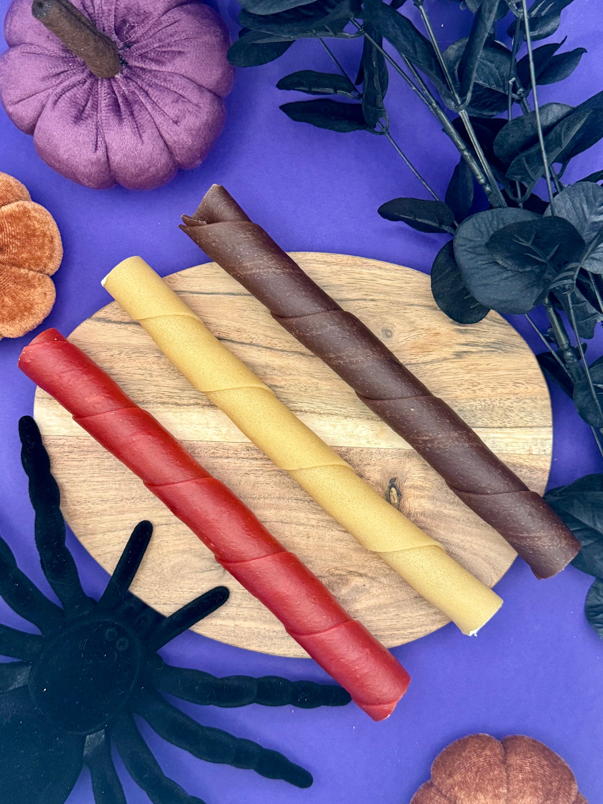 Brown & Red Sticks: Wheat Flour 39.06%, Corn Starch, Strawberry Powder / Purple Potato Powder, Vegetable Glycerin, Soy Protein Isolate, Potassium Sorbate