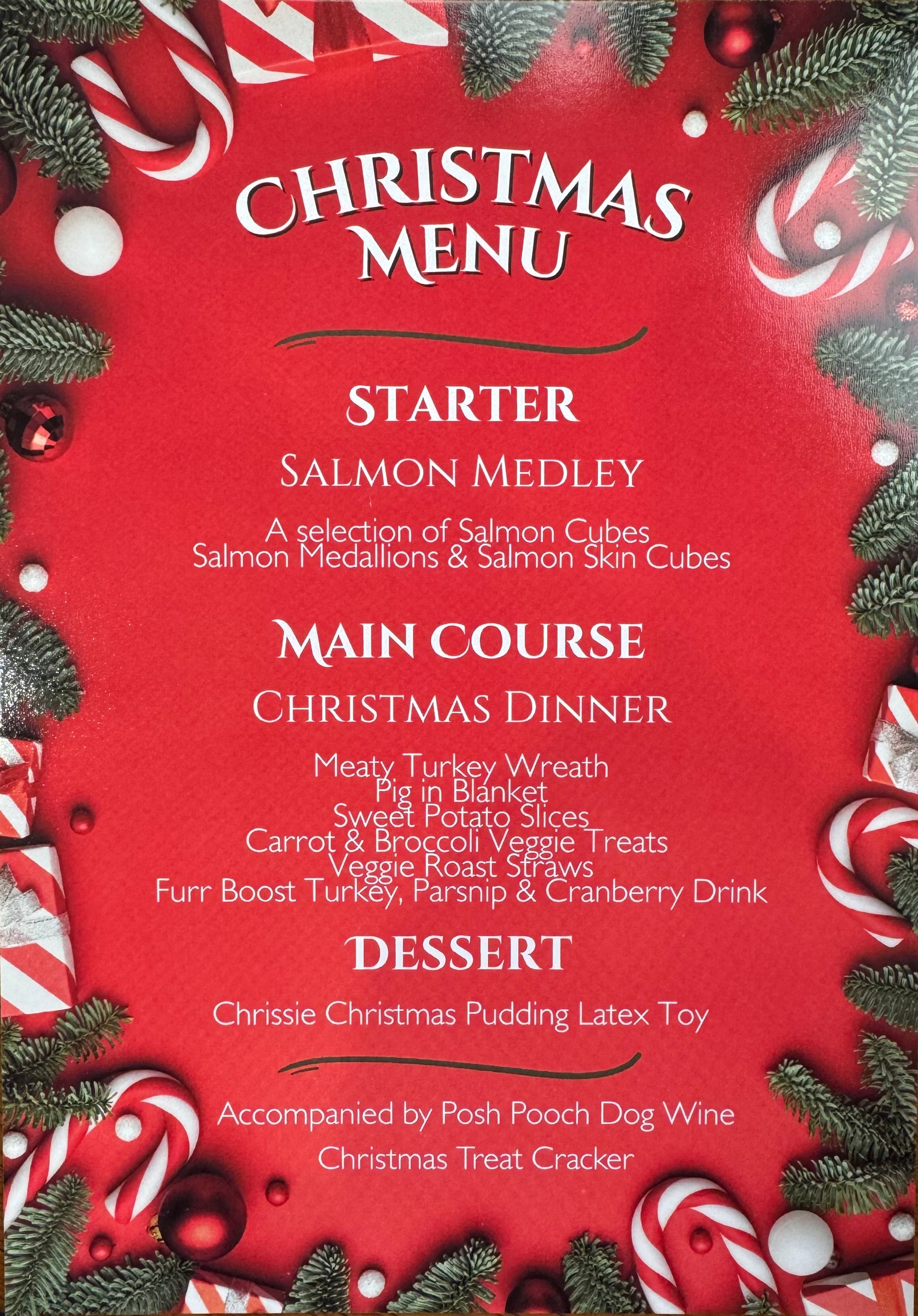 Let your pup celebrate the season in style with this complete Christmas feast designed just for them. Start with a mouth-watering salmon medley, move on to a satisfying turkey wreath loaded with all the festive trimmings, and finish with a special Christmas pudding treat. The experience is rounded out with canine-friendly wine and crackers packed with holiday surprises, it even comes with their own menu—making it a meal your dog will remember long after the decorations come down.